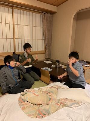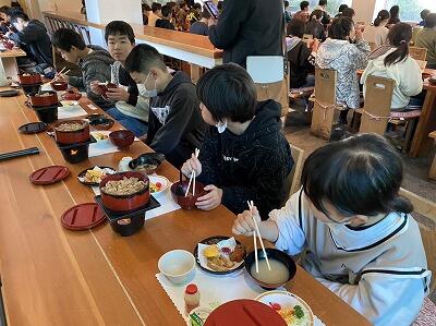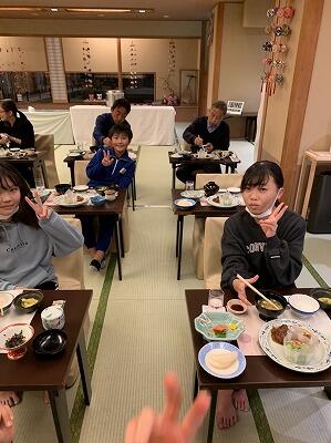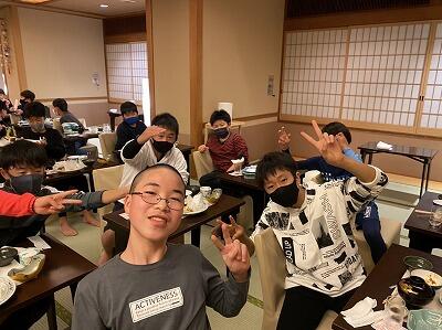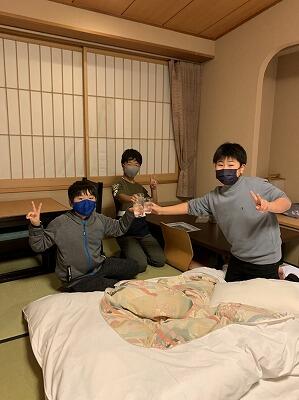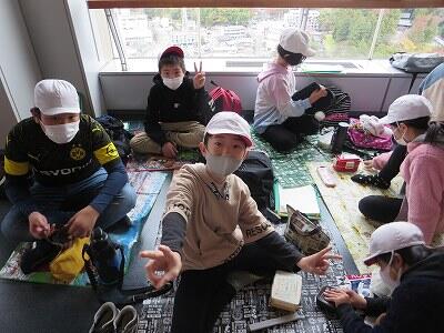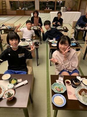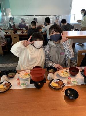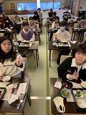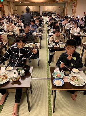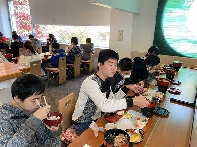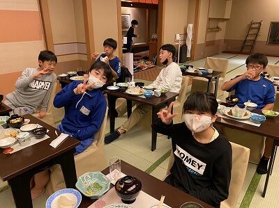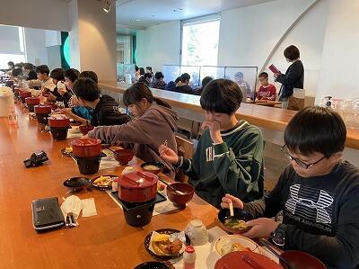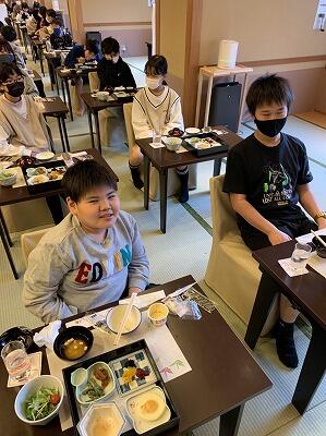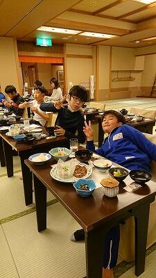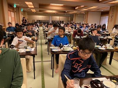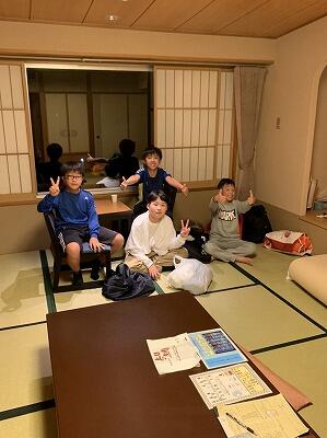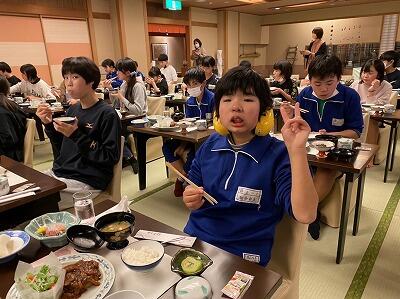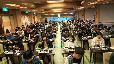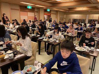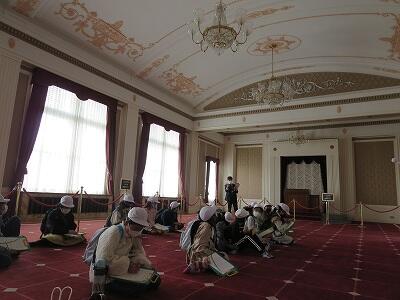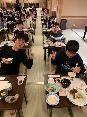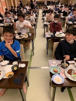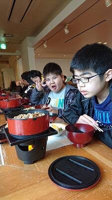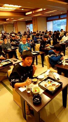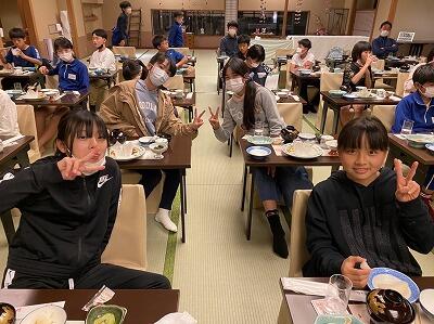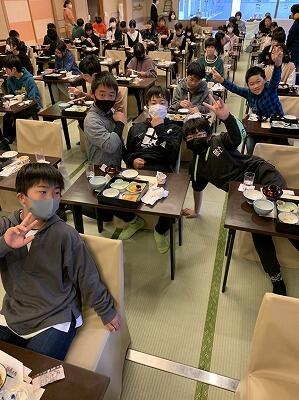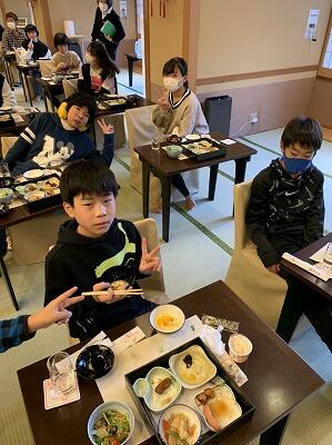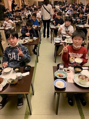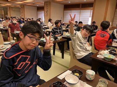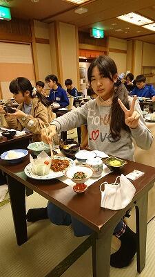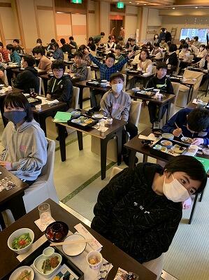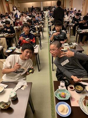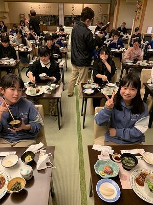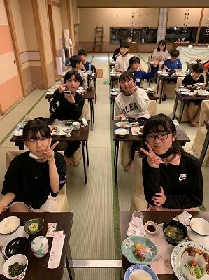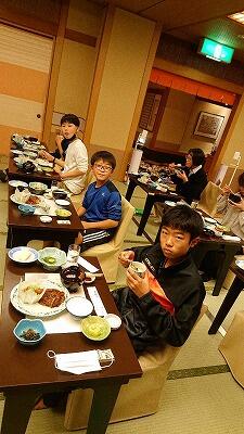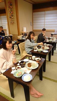6年修学旅行、夕食前の「赤べこ絵づけ」の様子です。