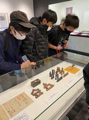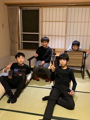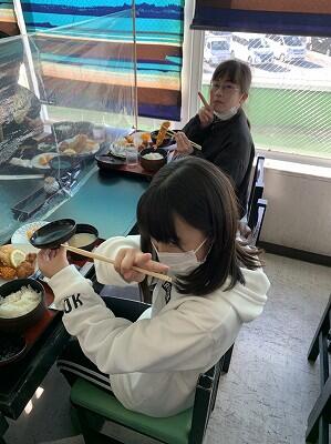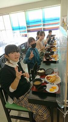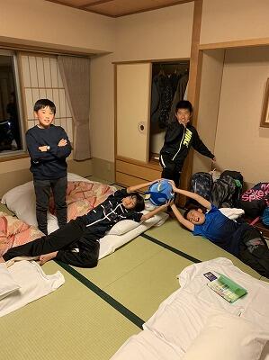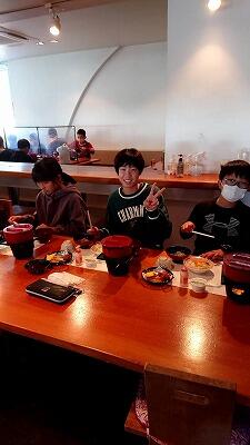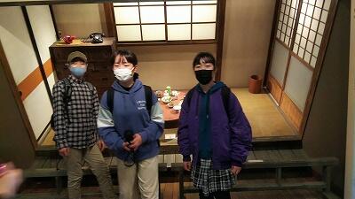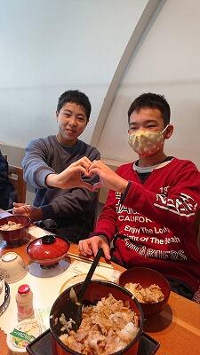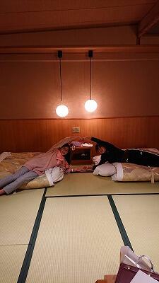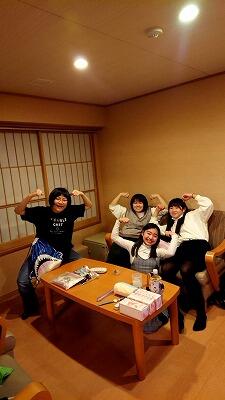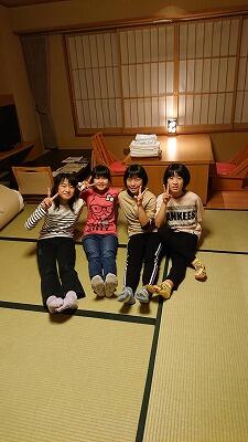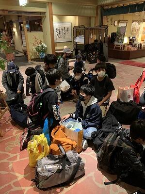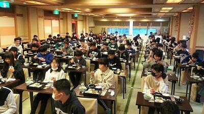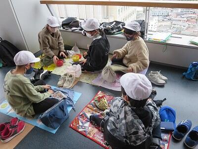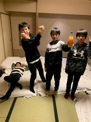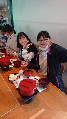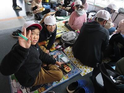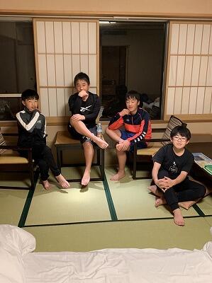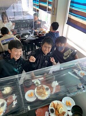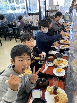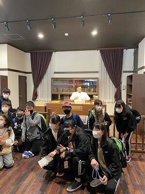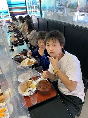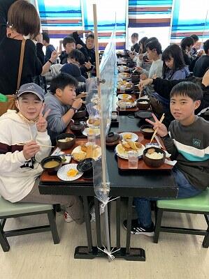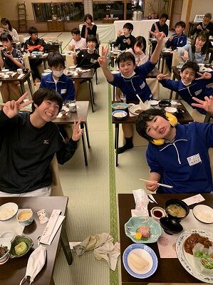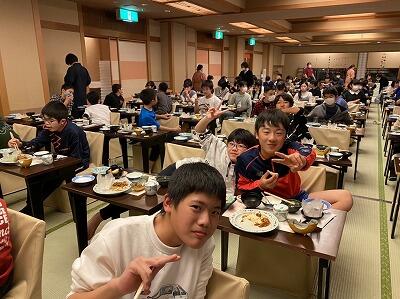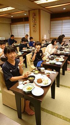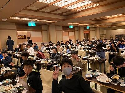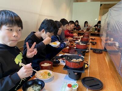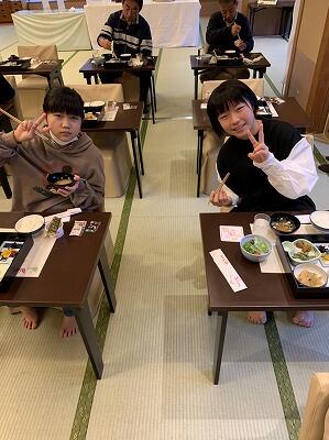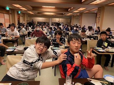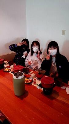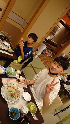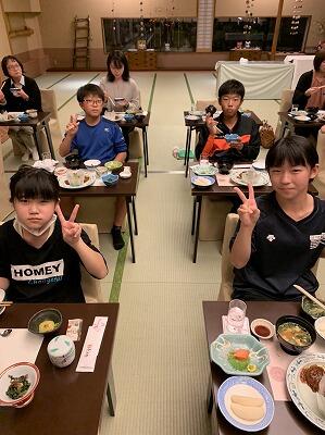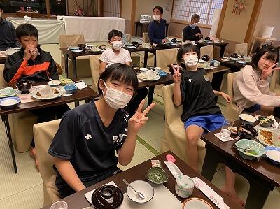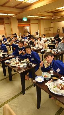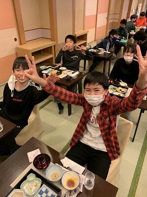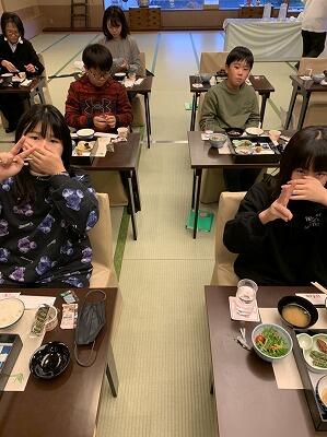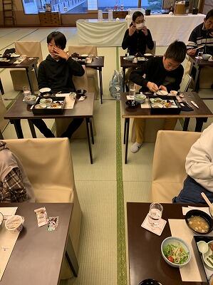 6年修学旅行、夕食前の「赤べこ絵づけ」の様子です。