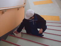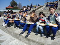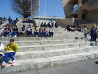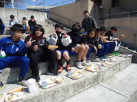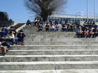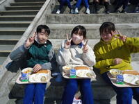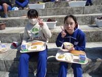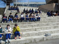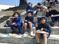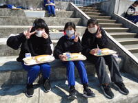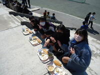 晴天の空の下、6年生児童が校庭の階段ステージで、楽しそうに給食を食べていました。