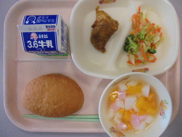 シェルパン 牛乳 タンドリーチキン ブロッコリーとキャベツのサラダ いちご杏仁豆腐