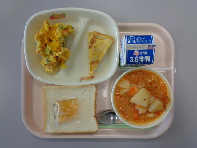 食パン(りんごジャム) 牛乳 アンサンブルエッグ かぼちゃのサラダ トマトクリームスープ
