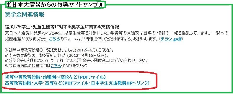 一覧については、「東日本大震災からの復興」サイトの中の奨学金関連情報をご覧いただき、下記サンプルの
