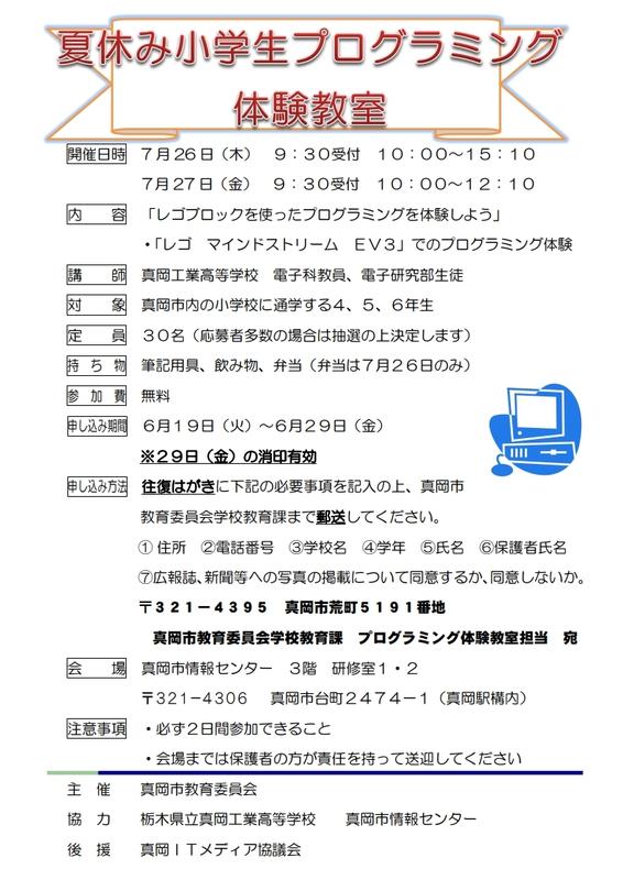 一覧へ 夏休み小学生プログラミング体験教室 投稿日時: 2018/06/25 真岡市教育委員会 市内の小学校に通学する4、5、6年生を対象に「レゴブロックを使ったプログラミングを体験する」プログラムです。 みなさんと知恵を絞って楽しい時間を過ごしましょう!