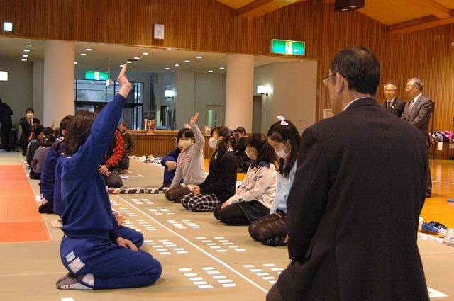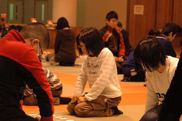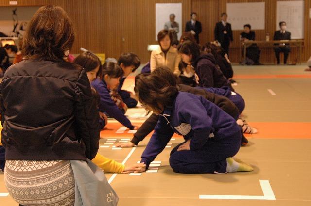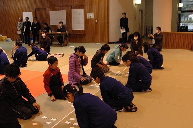 開会式後、柔道場にて、3チームずつの予選リーグを行い、各リーグで1位になったチームが決勝トーナメントに進出しました。会場では、読み手の西崎倫子先生(真岡西中)が読み札を読み上げるごとに、子どもたちから「はい」「はい」と元気な声が上がり、熱気に包まれていました。