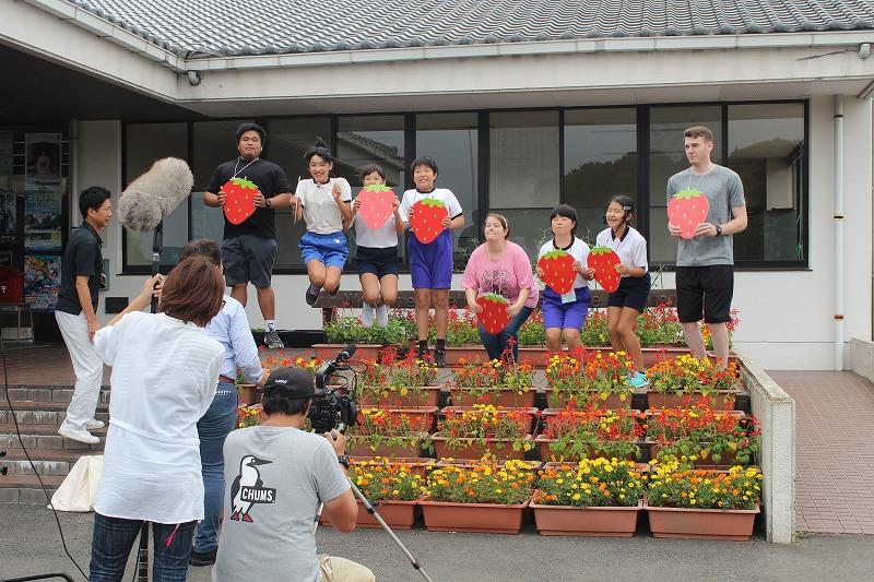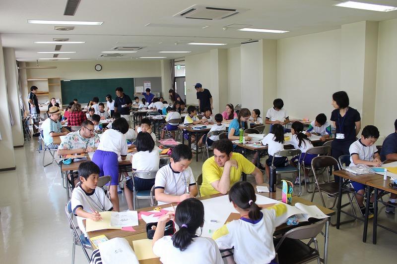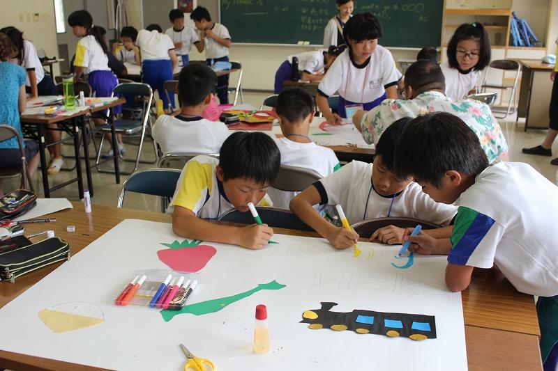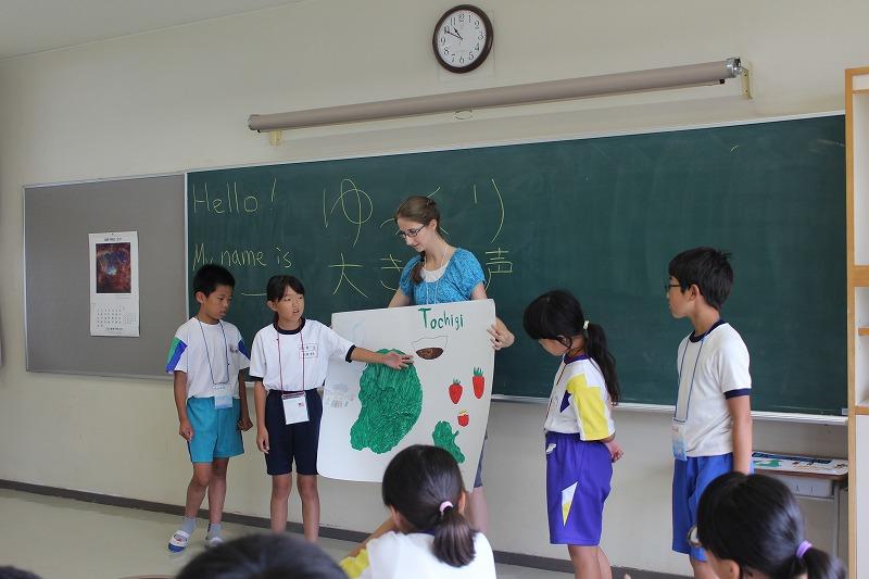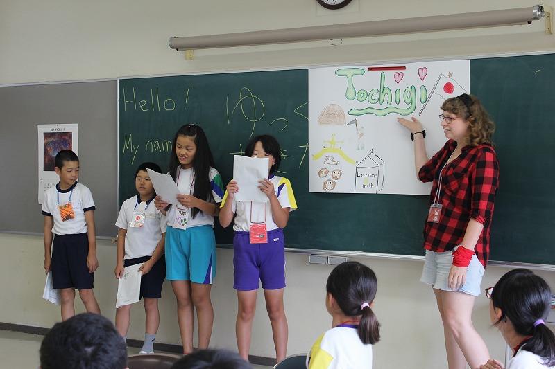 二日目は、朝食後、このCampの最終イベントである「真岡や栃木県を英語で紹介しよう!」でした。チームごとに模造紙に真岡のいちご、SL、日光東照宮等、紹介する事柄をまとめ、英語で発表しました。