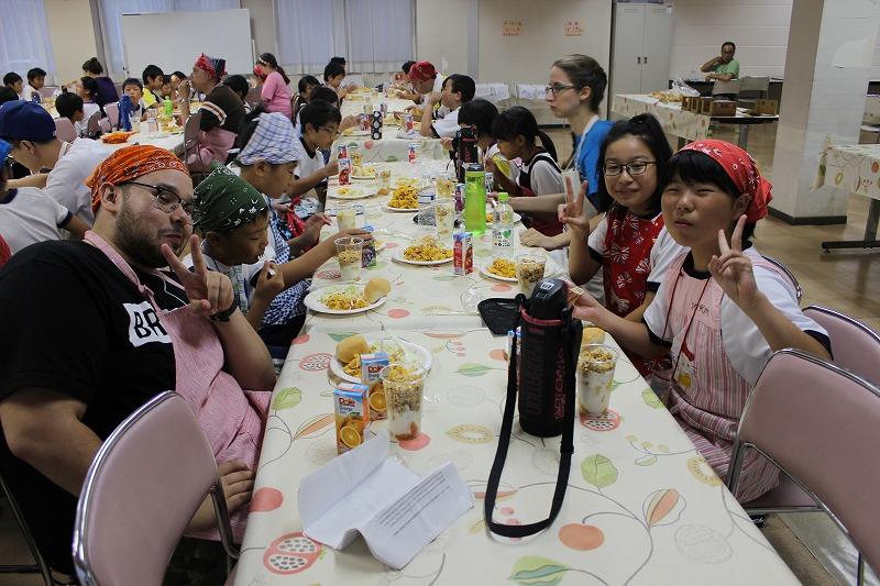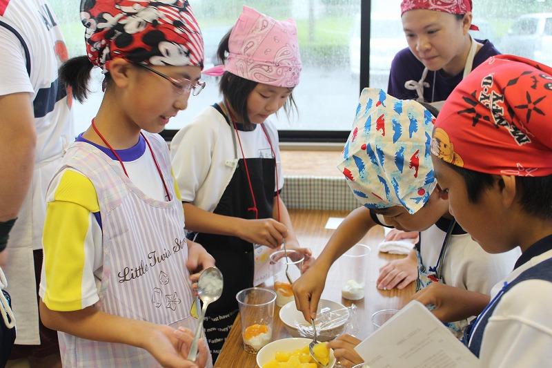 夕方からは、チームごとに、アメリカ・イギリスの家庭料理でマカロニにチーズを絡めたマカロニ&チーズ、コールスロー、パフェを作りました。児童達は慣れない手つきでキャベツやにんじんを包丁で切っていました。そして、料理作りで使われる英語をAETから学んでいました。