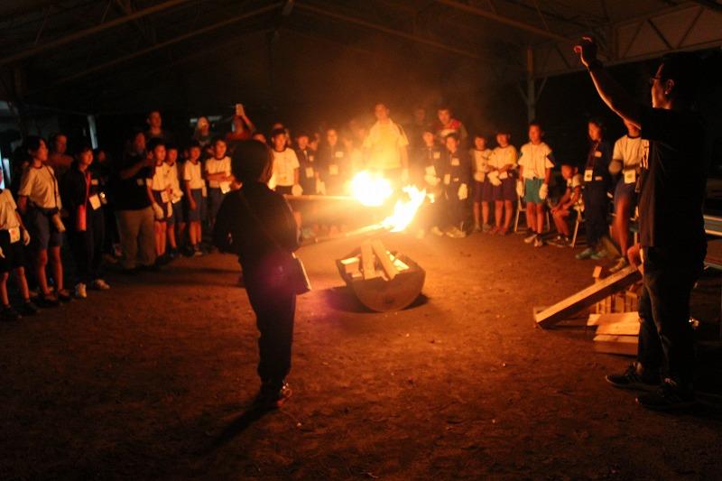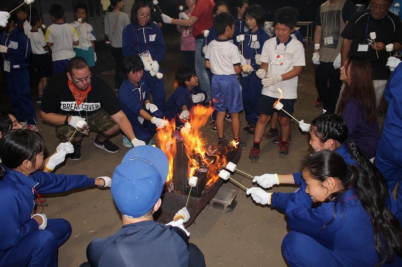 夜は降雨のため、予定されていたキャンプファイヤーができなかったので、野外テントの下で、ミニキャンプファイヤーを行い、恒例となっているマシュマロを焼きました。その味は「Good!」と大絶賛でした。