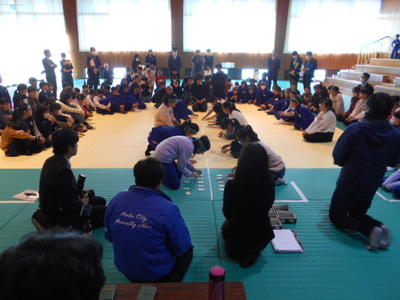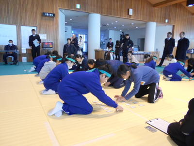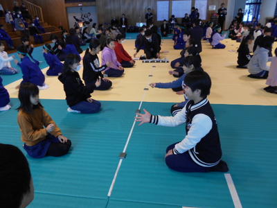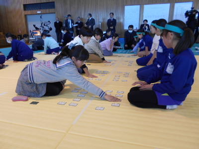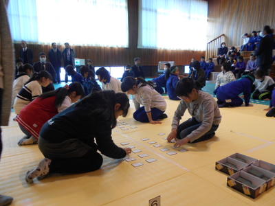 開会式後、柔道場にて、3チームずつの予選リーグを行い、各リーグで1位になったチームが決勝トーナメントに進出しました。会場では、読み手の西崎倫子先生(真岡西中)が読み札を読み上げるごとに、子どもたちから「はい」「はい」と元気な声が上がり、熱気に包まれていました。