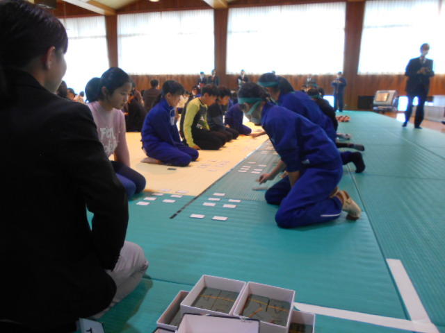 開会式後、3チームずつの予選リーグを行い、各リーグで1位になったチームが決勝トーナメントに進出しました。会場では、読み手の西崎倫子先生(真岡西中)が読み札を読み上げるごとに、子どもたちから「はい」「はい」と元気な声が上がり、熱気に包まれていました。