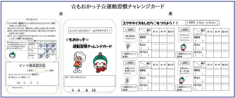 今回、このプログラムにある8つの視点のうち、視点7「運動習慣、生活習慣の改善」を図るため、家庭で気軽にエクササイズを実施できるよう工夫した「☆もおかっ子☆運動習慣チャレンジカード」を作成しました。