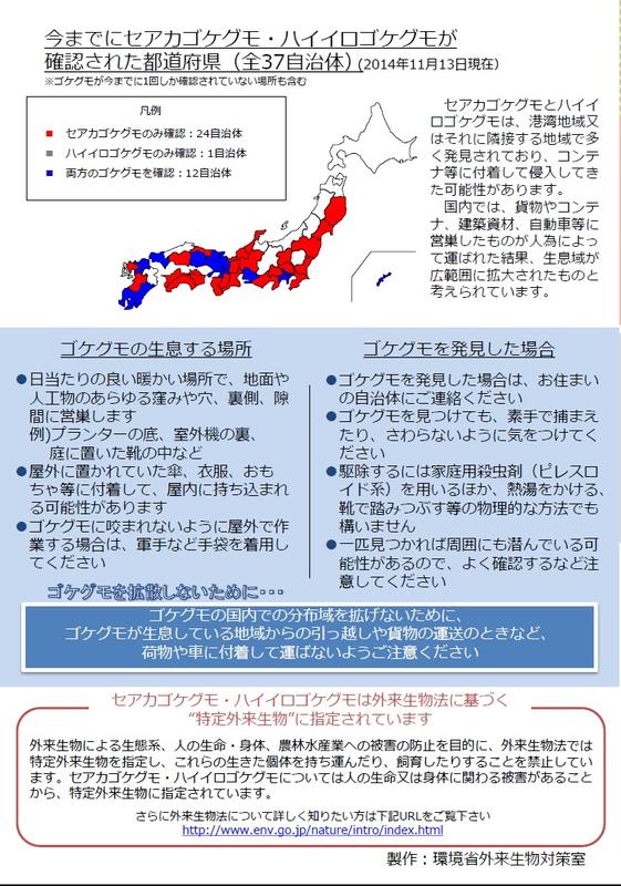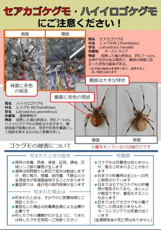 特定外来生物に指定されているセアカゴケグモが県内で初めて確認されました。発見場所 : 鹿沼市さつき町詳細については、下記の栃木県ホームページに掲載されましたのでご覧ください。県内におけるセアカゴケグモの確認について下記は環境省外来生物対策室で作成された資料です。