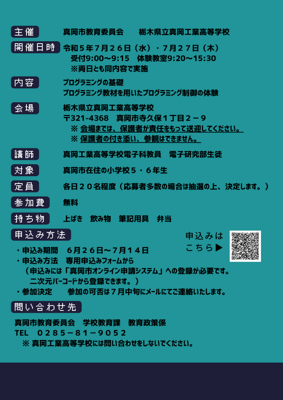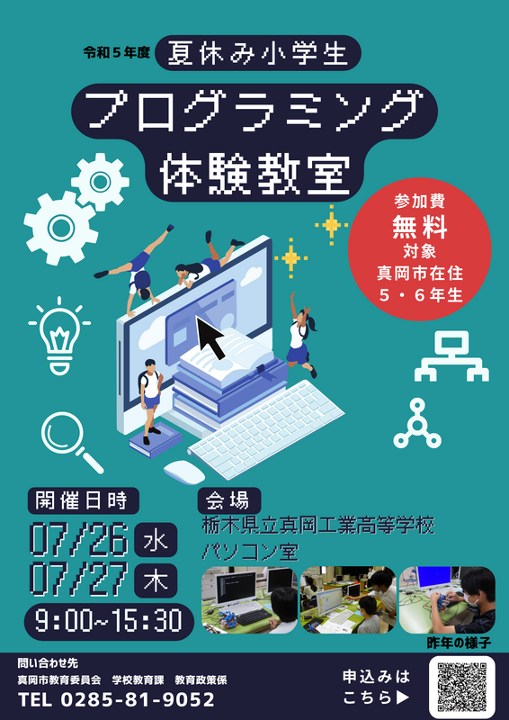 今年度も、「夏休み小学生プログラミング体験教室」を以下の通り実施します。