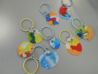 ペットボトルキャップの廃材を利用して、傘ホルダーやキーホルダーを作りました。