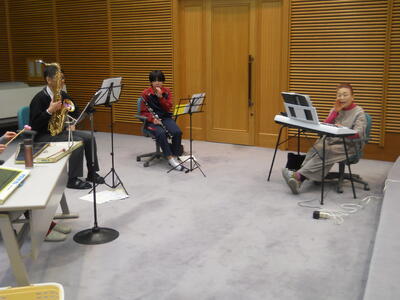 「子ぎつね」「もみじ」「あわてんぼうのサンタクロース」「あらののはてに」「ラバースコンチェルト」を演奏しました。口や手が痛くなりつつも、最後まで演奏できました。