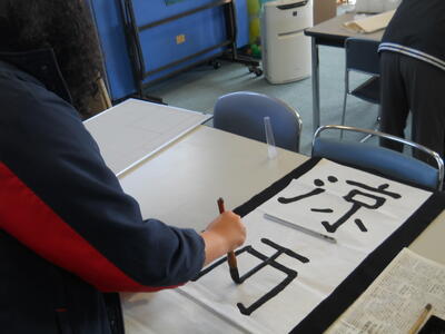 書道教室を実施しました。今日は、前回練習した文字を条幅に清書しました。文字の位置や大きさについて講師の先生からアドバイスを受け、集中して作品を仕上げました。