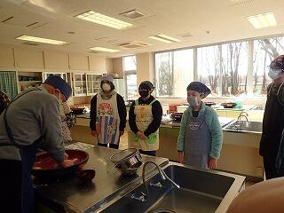 調理教室を実施しました。メニューはすいとん汁と混ぜ込みご飯のおにぎりです。すいとん汁は具材たっぷりの汁にすいとんをスプーンですくって入れてつくりました。おにぎりは、鮭とシラス2種類の混ぜ込み具材をご飯に入れてよく混ぜ、各自おにぎりを作りました。すいとん汁はとてもおいしくできて、皆お代わりをしていました。