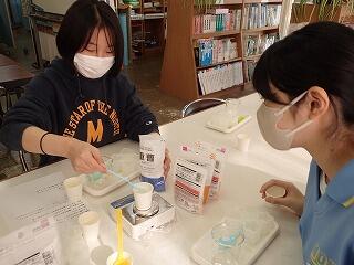 科学教室を行いました。重曹とクエン酸を使ってバスボムを作りました。はじめに、クエン酸と重曹の化学反応は酸とアルカリの中和だということを学びました。理科の学習で学んだことを振り返りながら薬品を計り取ったり混ぜたりしました。混ぜた材料を型に入れて押し固めてできあがりです。使うときが楽しみです。