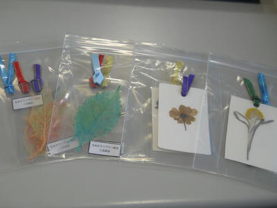 次に、葉脈しおりや押し花しおりの袋詰めをしました。リボンの配色などを考えて組み合わせていました。