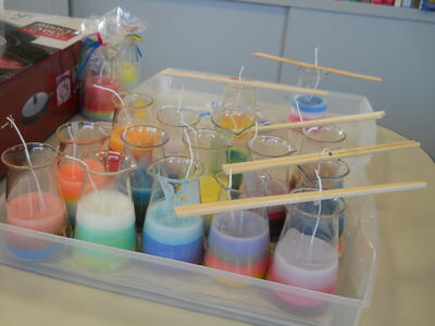 初めに、カラーキャンドルの仕上げをしました。ほぼ出来上がったので、あとはラッピングや値札を貼って完成です。
