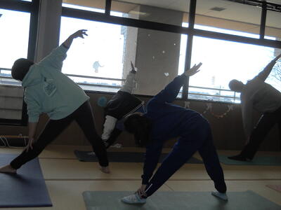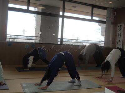 ヨガ教室を実施しました。いつものように、ボランティアの先生が見本を示してくださる姿勢を作っていくと、繰り返しているうちに少しずつできるようになり、体もじんわりと温まってきます。普段使っていない筋肉を使い、関節を大きく動かし、体が軽くなって感じがします。健康や心に関わるお話やもたくさん聞くことができました。年間4回あった教室も今日が最後です。1年間ご指導ありがとうございました。