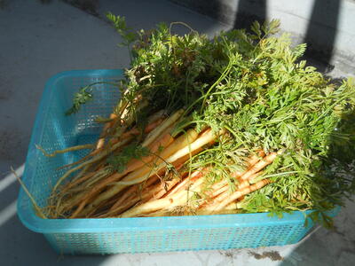 今日は久しぶりに農園作業をしました。ニンジンを収穫しましたが、ごぼうのように細いニンジンができました。途中で折れないように、丁寧に掘って収穫していました。またお昼には生のニンジンをかじって、味を確かめてみました。残ったニンジンは今日来室した通室生のお土産になりました。