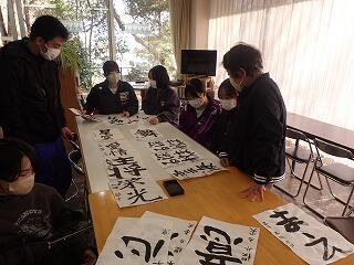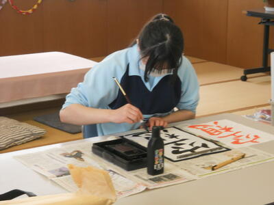 書きたい言葉を各自考え、その中の一文字を半紙に大きく書きました。運筆について丁寧に教えていただき、一枚書くごとに上達していきました。
