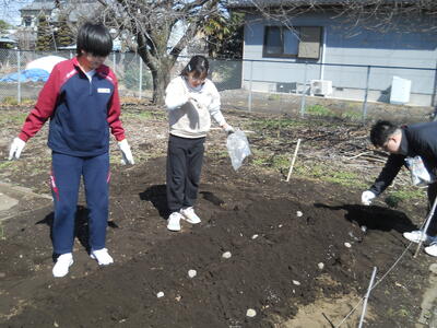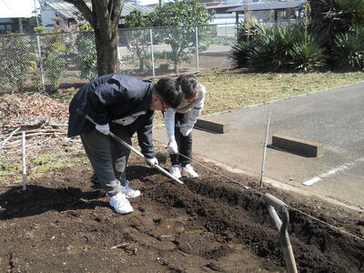 まずは真岡教室からいただいたジャガイモの種芋を蒔きました。先週のうちに農園の畑に肥料をまいておいたので、早速鍬を使って溝を作り、種芋を蒔きました。次は、たまねぎのマルチがけもしました。おいしいジャガイモやたまねぎができますように!