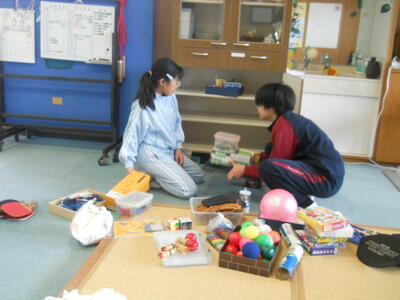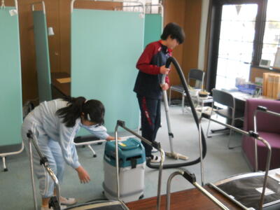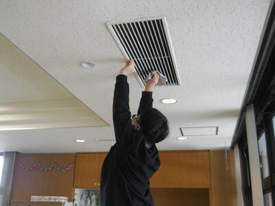 まずは毎月の活動報告を片付け、普段はあまりできない天井にある換気口の掃除や、遊具類の入っている棚の整理整頓などをしました。最後に掃除機を使って教室内をきれいにしました。