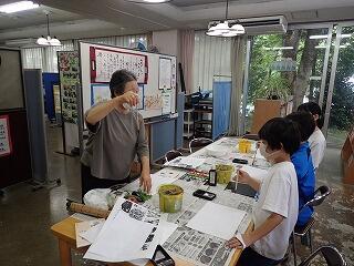 石田先生を講師にお迎えし、書道教室を実施しました。児童生徒はそれぞれ書きたい文字を選び、先生に教えていただきながら練習しました。何枚も丁寧に書き、その中から一番気に入ったものを選び、名前を書いて仕上げました。