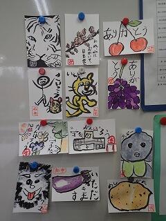 飯野先生のご指導いただき、絵手紙教室を行いました。「へたでよい。へたがよい。ただ、心を込めて」と、絵手紙について教えていただき、絵手紙の筆の使い方を練習し、各自が思いを込めて絵手紙を描きました。