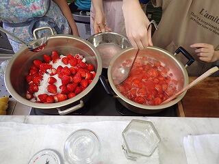 昨日の活動です。午前中は、農家の方のご協力で、子どもたちは「イチゴ狩り」を楽しみました。完熟した真っ赤なイチゴはとても甘くて、すごくおいしかったです。午後は、摘んだそのイチゴで「ジャムづくり」。新鮮なイチゴと砂糖を煮詰めて、自家製ジャムができあがりました。クラッカーにのせて試食をしましたが、こちらもとてもおいしくできました。瓶詰めをして、家族へのお土産もできました。