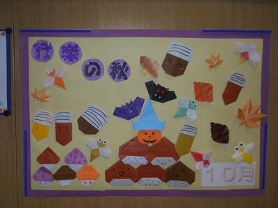 今日は10月の壁面作成をしました。以前から少しずつ折り紙などで作っておき、今日はレイアウトや糊付けなどを行い、完成させました。