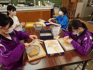 ポップコーン作りを行いました。収穫して室内に干しておいたもろこしを各自が選び、コーンの粒を実から外すところから始めました。粒の小さいものや傷のある粒、ゴミなどを取り除くのが大変でした。取ったコーンの粒で早速ポップコーン作りを行いました。焦げないように加熱し、塩味を付けて完成。とてもおいしくできあがりました。