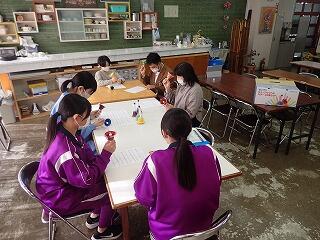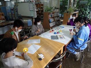 草木染め教室を実施しました。今年はタマネギの薄皮を使って染色しました。同じタマネギで染色しても、媒染液によって発色が変わることをボランティアの先生から教えていただき、鉄焙煎にするかアルミニウム焙煎にするか決めてから作業に取りかかりました。全員草木染めを経験していたので、手際よく作業を進めていました。鮮やかに染色できたことや出てきた模様にとても満足していました。