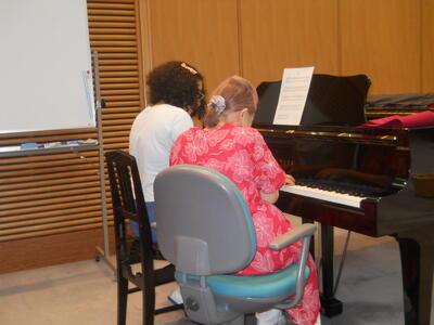 童謡の「こぎつね」をピアノや木琴で練習をしました。初めてピアノに触れる通室生もおり、熱心に練習していました。木琴を練習した通室生も、楽譜にドレミを書いて頑張っていました。