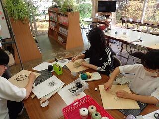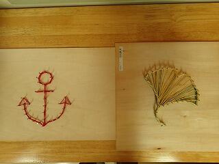 ストリングアートに挑戦しました。好きなデザインの型紙を選び、型紙に合わせて木の板の釘を打ちました。釘をまっすぐ打つこと、狭いところに何本も打つことが難しく、苦労しました。仕上げは、好きな色の糸を選び、釘にいとをかけて完成です。糸のかけ方で仕上がりに変化がでて個性ある作品ができました。