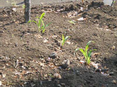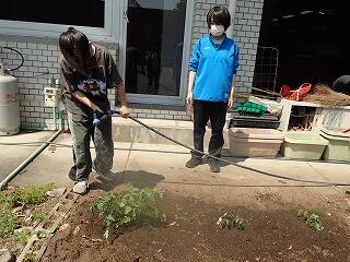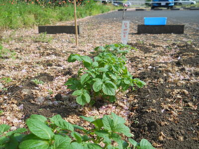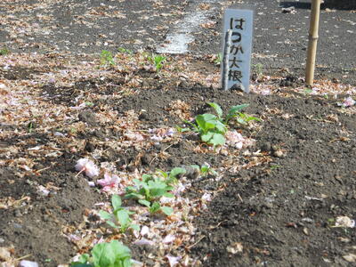 4月初めにまいた、じゃがいも、はつか大根、とうもろこしが桜の木の下で目を出してきました。その他に、真岡教室から頂いたニンジンやネギの種もまきました。センターの職員さんからも「順調に育って、よかったですね」と言葉をかけていただきました。通室生と収穫をするのが今から楽しみです。