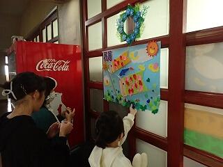 折り紙で掲示物のかざりを作りました。折り紙を折った先をさらに細かく折り進めるのに苦労しましたが、教え合いながらかざりを作りました。作った折り紙を入り口の掲示物に飾り付けしました。