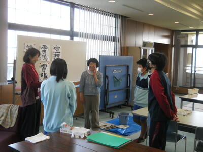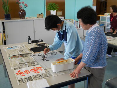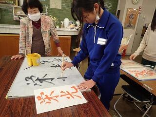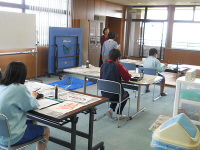 石田先生を講師にお迎えして書道教室を行いました。「2文字を書く」を課題にして各自題材を選び、集中して練習しました。運筆を丁寧に教えていただき、はじめに書いた文字よりもかなり上達しました。