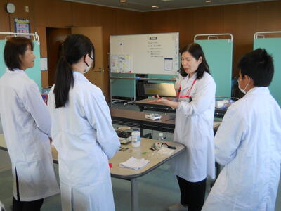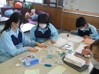 おそろいの白衣を着て、安全に配慮しながら集中して取り組むことができました。通室生からは、「はじめての体験でしたが、楽しかったです」「集中して歯ブラシを使って、とんとんすることができました」など振り返りが記入してありました。ぜひまた取り組んでいきたいと思います。大山先生、ありがとうございました!