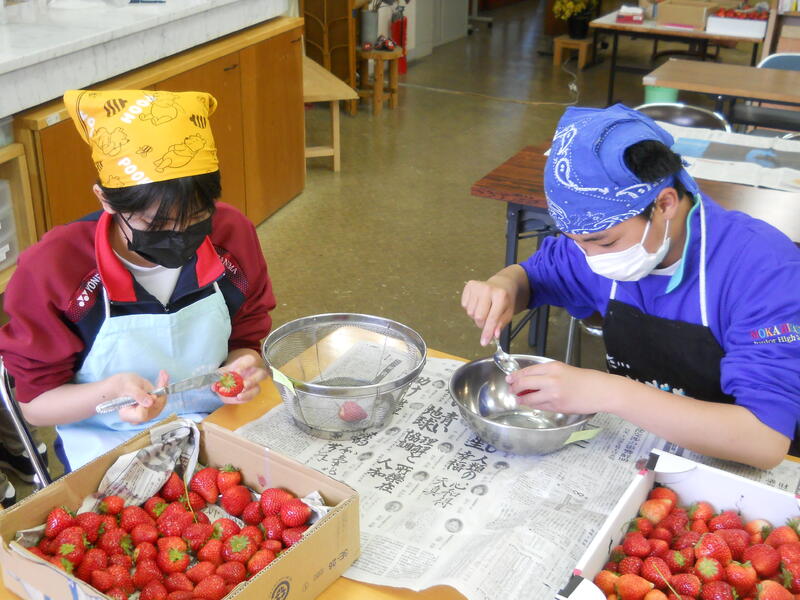 物部地区のいちご生産農家の方にご協力いただき、真岡教室と二宮教室合同でイチゴ狩りを実施しました。いちごの葉が茂っている中から、宝探しをしているかのように赤くなったいちごを見つけては摘み取っていました。収穫したいちごを使って、ジャムづくりをしました。いちごのへたを取り、いちごと砂糖を鍋に入れて煮詰めました。できあがったジャムを、早速味見しました。レモン汁を入れたので、鮮やかな赤い色のジャムに仕上がりました。ジャムを瓶に詰め、生のいちごと一緒に各自持ち帰りました。