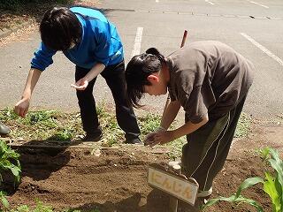 花壇にポップコーンとにんじんの種をまきました。また、プランターには、小ネギの種をまきました。草が伸びてきていたので除草も行いました。