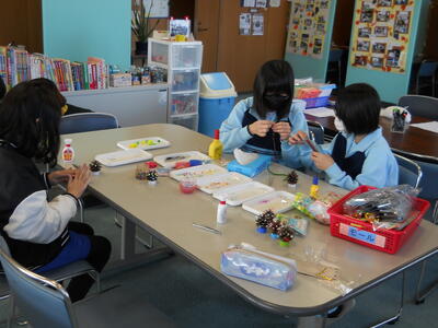 今日はクリスマス会の飾りを、松ぼっくりやビーズ、モールなどを使って制作しました。