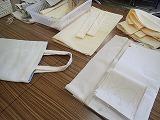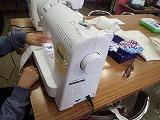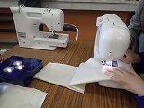 写真右は、材料と製作の見本で、今回は「エコバッグ」を作ります。昨年の続きからの作業となるので、ミシン縫いから始めました。ミシンを操作する表情は真剣そのもの。きれいに揃ったミシンの縫い跡を見て、思わずにっこりと笑みがこぼれました。