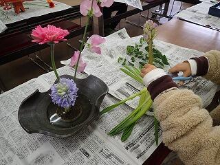 「ライブリー教室作品展」に展示する「生け花」をボランティアの先生にご指導いただき活けました。先生が花器も剣山も生花もすべて準備してくださって、子どもたちは、抵抗なく生け花の美を追究できたようです。