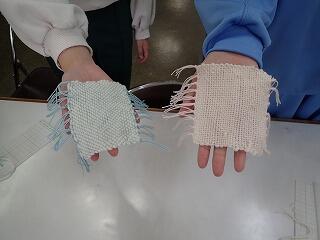 午後、手芸を行いました。前回作っていた機織りコースターの最後の仕上げをしました。縦糸はほつれないように4本ずつ束ねて縛り、長さをそろえて切りました。横糸の端をコースターに編み込み完成です。満足いく仕上がりとなりました。
