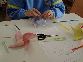 理科工作で、ブーメランと紙トンボを作りました。ブーメランはどのように投げれば自分のところに戻ってくるか試しました。紙トンボは厚紙から部品を切り出し、見本品の構造を確認しながら組み立てました。完成した紙トンボで誰が一番遠くまで飛ばせるか競争しました。