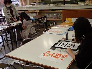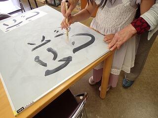 石田先生のご指導で、書道教室を行いました。手本の中から書きたい文字を選び、書道に挑戦!書写水書板で運筆を練習し、手本をよく見ながら書写しました。よく書けた作品を2枚、展覧会用に保管しました。