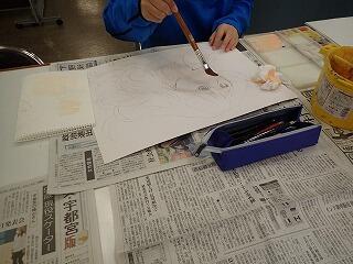 青山先生と石田先生のご指導で、絵画教室を行いました。ぬいぐるみ、果物の写真、小説の登場人物などを題材にして、下絵から彩色まで行いました。