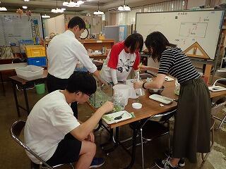 アクアリウムづくり(9月29日) 投稿日時 : 09/29 もおかライブリー教室 球状の高吸収ポリマーを使ってアクアリウムづくりに挑戦しました。ボトルに入れた高吸収ポリマーの中に魚の模型や貝を入れます。球状の粒の中にあるので、ボトルの外からは魚も貝も形が分かりません。そこに水を注ぐと中の魚や貝が見えてくるのでとても不思議です。光の性質を利用したものなので、実験を交えながら中が見えてくる理由を考えました。とてもきれいなアクアリウムが完成しました。